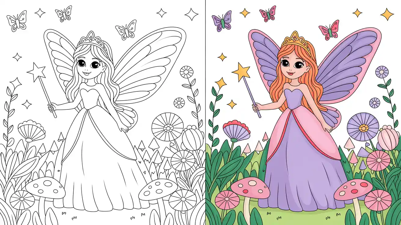Step into a world of sparkling wings, flowing gowns, and gentle magic with our fairy princess coloring pages.